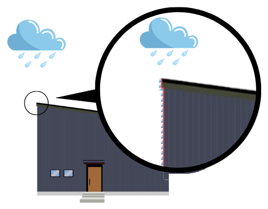 屋根の頂点部分である棟あたりに落ちた雨は、片流れ屋根の構造上、軒の裏側を伝い、外壁に向かって流れやすくなります。このとき、外壁と屋根の繋ぎ目部分から雨水が侵入してしまう可能性があり、この部分が一番雨漏りを起こしやすいと言われています。上記でも述べたように、片流れ屋根は外壁が紫外線などの影響を受けやすいため、外壁と屋根の繋ぎ目部分が劣化していると、あっという間に雨漏りを引き起こします。