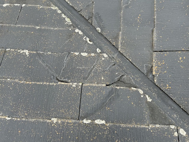 屋根はコロニアルという種類の屋根材です。屋根に登ってみると、全体的にひどく割れやヒビが目立ちました。