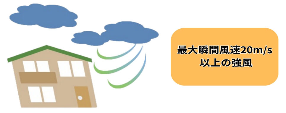 | 被害状況 | 台風、突風、竜巻、暴風などによる被害(最大瞬間風速20m/s以上の強風) |