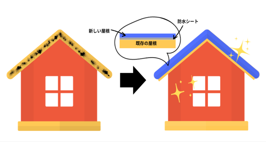 既存の屋根の上から新しい屋根材を被せる事で屋根が二重構造になり、断熱性や遮音性、防水性が高まるメリットがあります。