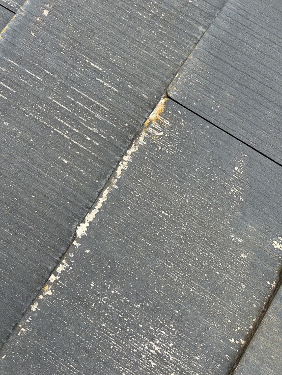 塗膜が剥がれ、コロニアル一枚一枚の先の方から白っぽくなっている状態です。塗膜が剥がれているということは本来の防水機能が低下してきているサインです。
