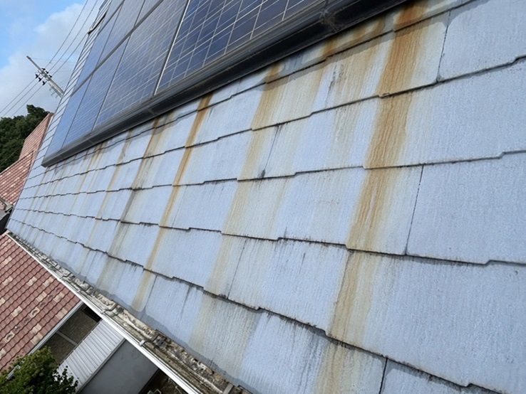 既存の屋根はコロニアル屋根で築年数は約20年程ですが、写真の通りまず全体的に垂れているかのような錆が目立ちました。
