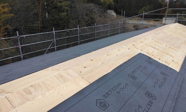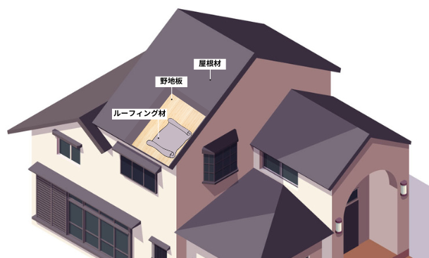 屋根は簡単に言えば野地板、ルーフィング材、屋根材の3層構造になっており、ルーフィング材は雨水が野地板にしみ込まないように防水する建材です。屋根材やルーフィング材は防水機能があるのに対し、野地板は木材であるため、水を吸収しやすくなります。なので最終的に防水し雨水を食い止めるのはこのルーフィング材になるというわけです。