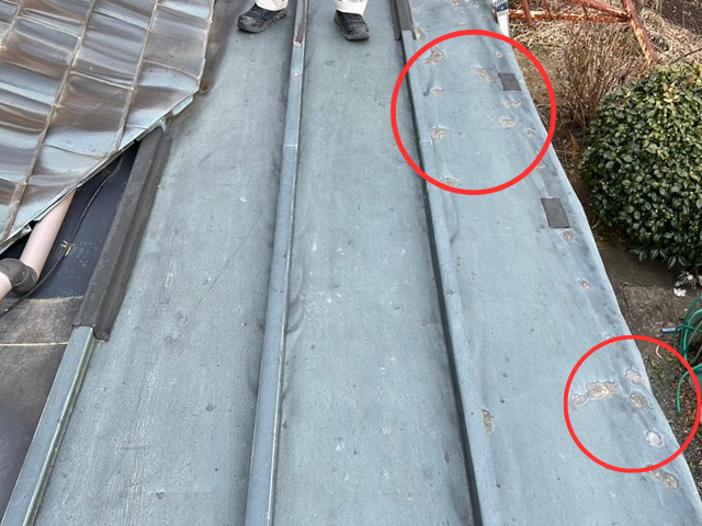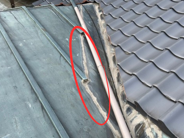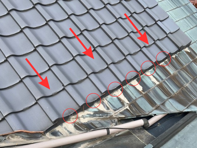 屋根に降った雨水が流れ落ちる際に、瓦と銅板の接する段差の部分に雨水が集中しやすくなるため、↑赤丸部分の劣化が進みやすくなります。