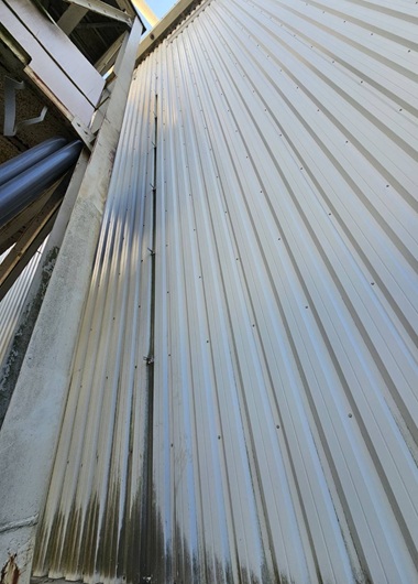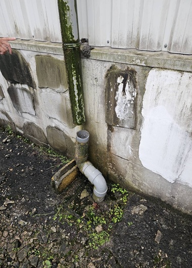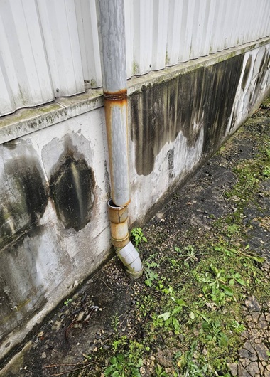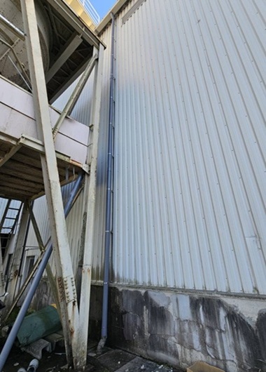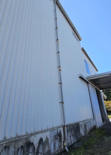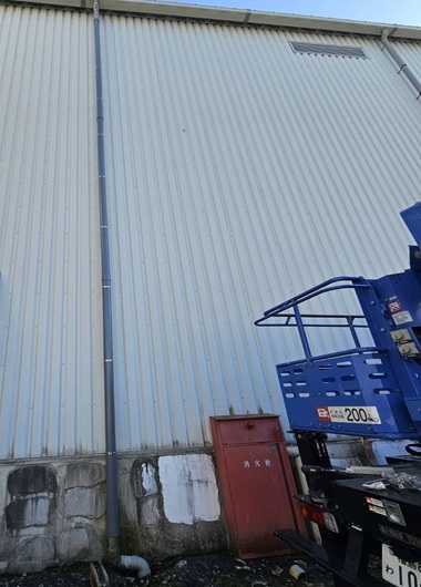 倉庫外壁に取り付けられていた既存の竪樋は、経年劣化により継手部分からサビが発生していました。