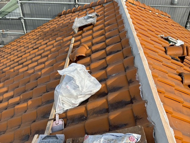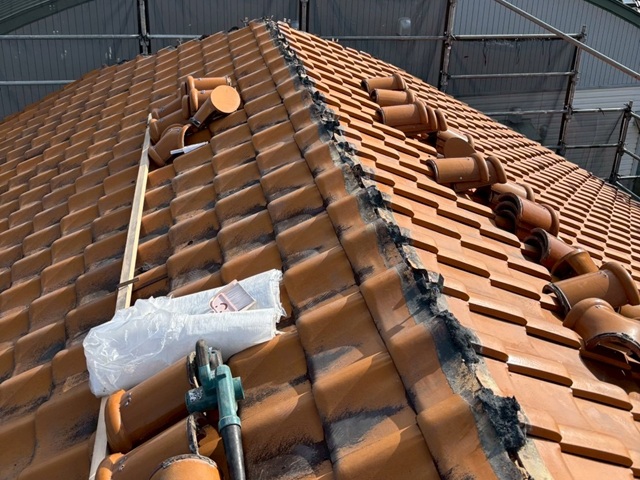 今回の施工では、既存の棟瓦を撤去し、既存瓦を再利用しつつ、積み直していきます。