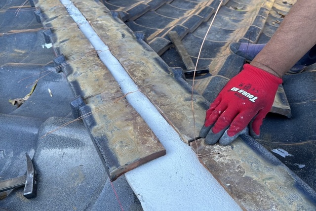 棟瓦の継ぎ目や端部は、強風や地震の揺れの影響を受けやすく、わずかな隙間から雨水が入り込みやすい場所です。棟瓦の固定と防水性を高めるためにしっかり接着処理を行います。