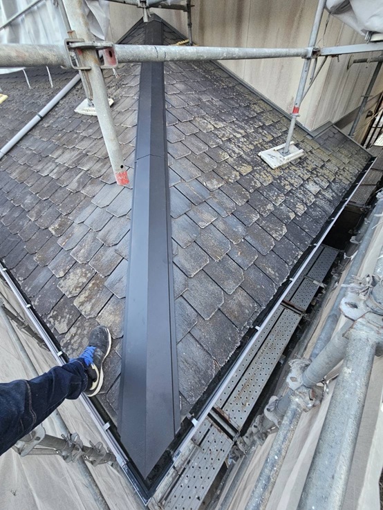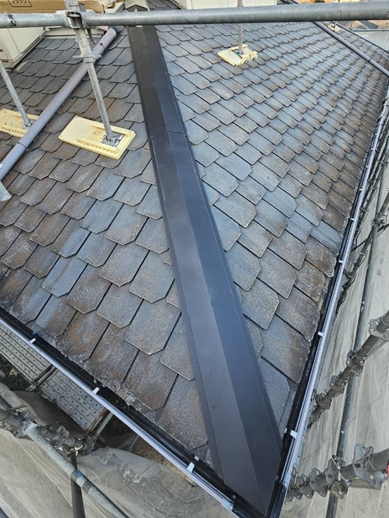 新しい下地と棟板金を設置し、しっかりと固定・防水処理を行いました。見た目がきれいになっただけでなく、内部まで安心できる状態に仕上がっています。